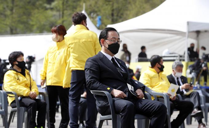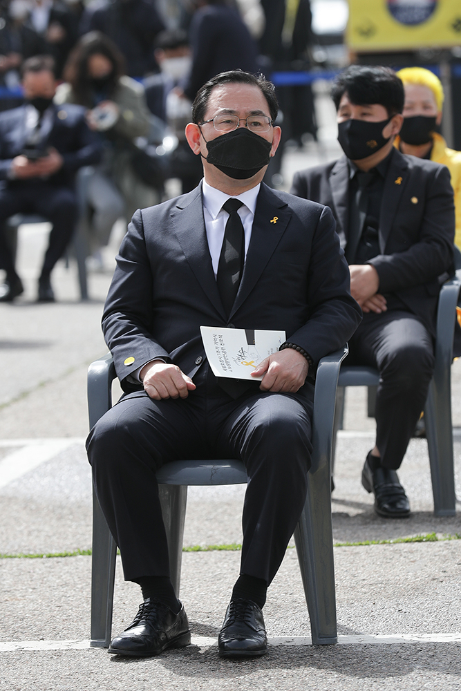 16일 오후 경기 안산시 화랑유원지에서 열린 '세월호 참사 7주기 기억식'에 참석한 주호영 국민의힘 대표 권한대행.