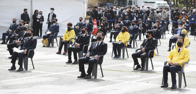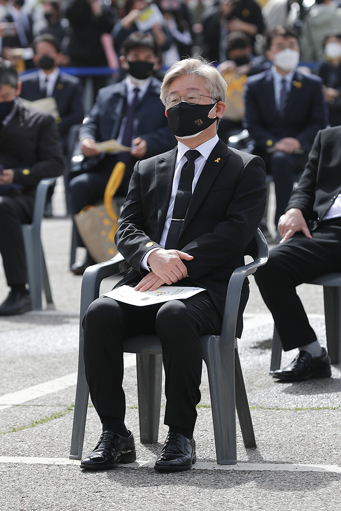 16일 오후 경기도 안산시 단원구 화랑유원지에서 열린 세월호 참사 7주기 기억식에서 이재명 경기도자사가 참석하고 있다.
