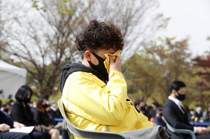 세월호 참사 7주기인 16일 오후 경기 안산시 화랑유원지에서 열린 '세월호 참사 7주기 기억식 및 4·16생명안전공원 선포식'에서 한 유가족이 눈물을 훔치고 있다.