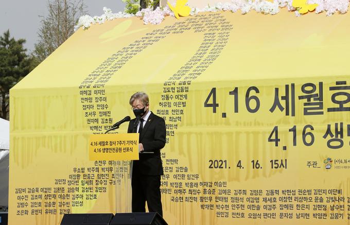 이재명 경기도지사가 세월호 참사 7주기인 16일 오후 경기 안산시 화랑유원지에서 열린 '세월호 참사 7주기 기억식 및 4·16생명안전공원 선포식'에서 추도사를 하고 있다.