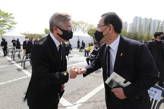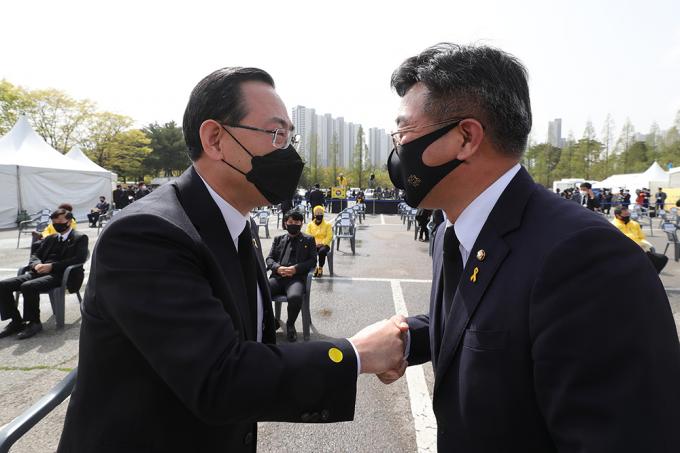 16일 오후, 경기도 안산시 단원구 화랑유원지에서 열린 세월호 참사 7주기 기억식에서 국민의힘 주호영 원내대표와 더불어민주당 윤호중 신임 원내대표가 식전 인사를 나누고 있다.