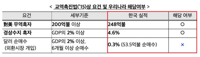 한국은 위 3가지 중에서 무역 흑자(248억 달러)와 경상수지 흑자(4.6%) 관련 요건을 충족했다.