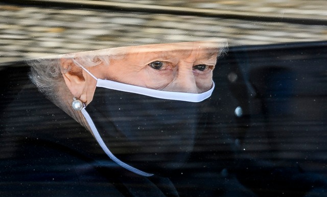 장례식장에서는 모두가 마스크를 쓰고 거리두기를 지켰다. 그 때문에 여왕은 떨어져 혼자 앉아야 했다.