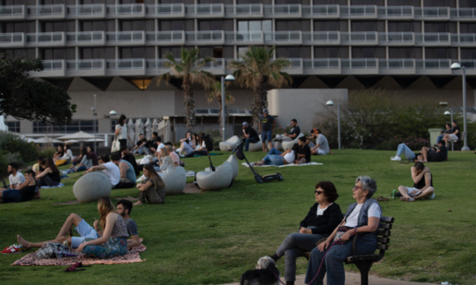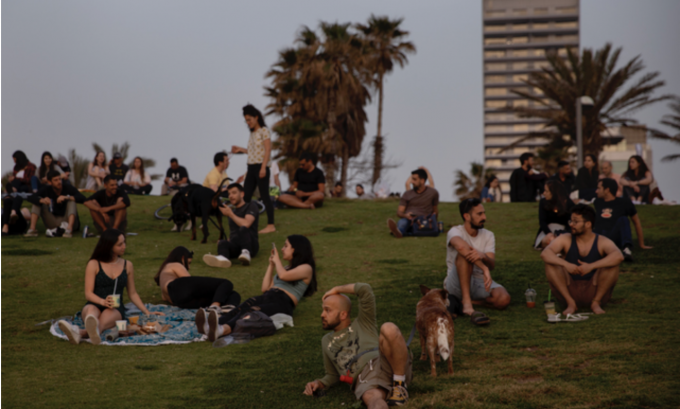 이스라엘의 '실외' 마스크 착용 의무 해제일인 18일(현지시간) 이스라엘 텔아비브에서 마스크를 쓰지 않은 시민들이 일몰을 즐기고 있다. 세계에서 가장 빠른 속도로 코로나19 백신 접종에 나섰던 이스라엘은 국민의 53%에 상당하는 497만 명에 대해 두 차례 백신 투여를 완료해 집단면역을 대폭 늘렸다. [AP 뉴시스]