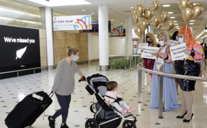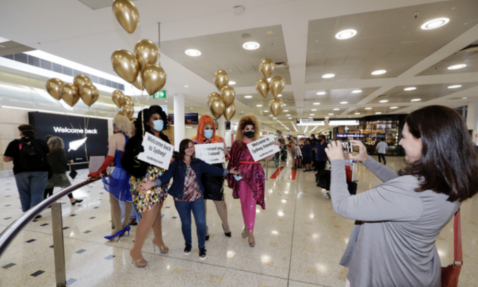 호주와 뉴질랜드 간 '트래블 버블'이 시작된 19일(현지시간) 호주 시드니 공항에서 여장 남자(드래그 퀸)들이 뉴질랜드 여행객들을 환영하고 있다. '트래블 버블'은 코로나19 사태 중 방역이 우수한 지역 간에 서로 여행을 허용하는 협약이다. 해외 입국자 2주 자가격리가 면제되는 등 제한 조치가 완화된다. [AP 뉴시스]