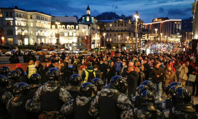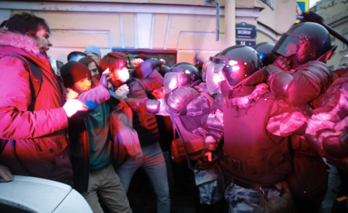 21일(현지시간) 상트페테르부르크에서 시위대가 경찰과 충돌하고 있다. [AP 뉴시스]
