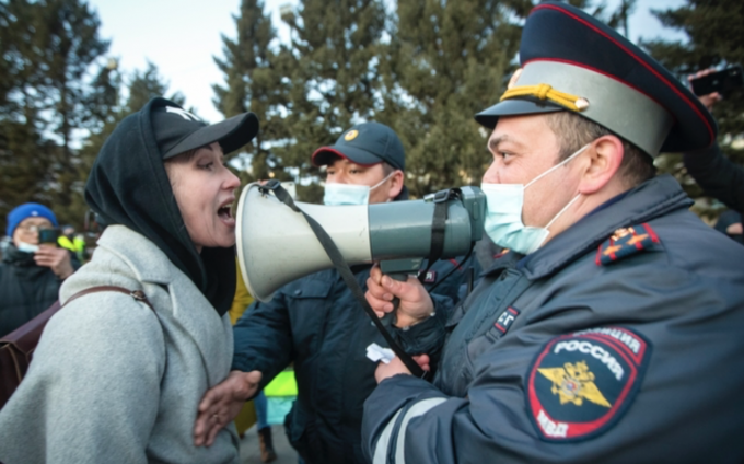 러시아 전역에서 야권 지도자 알렉세이 나발니의 석방을 촉구하는 시위가 열린 21일(현지시간) 울란우데에서 시위에 참가한 한 여성이 경찰관에 항의하고 있다. 정치적 탄압을 감시하는 인권단체는 시위와 관련해 전국에서 최소 400명이 체포됐다고 주장했다. [AP 뉴시스]