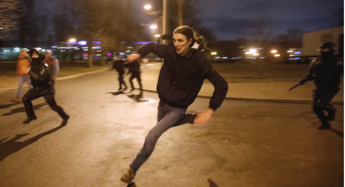 21일(현지시간) 상트페테르부르크에서 한 시위 참가자가 경찰을 피해 달아나고 있다. [AP 뉴시스]