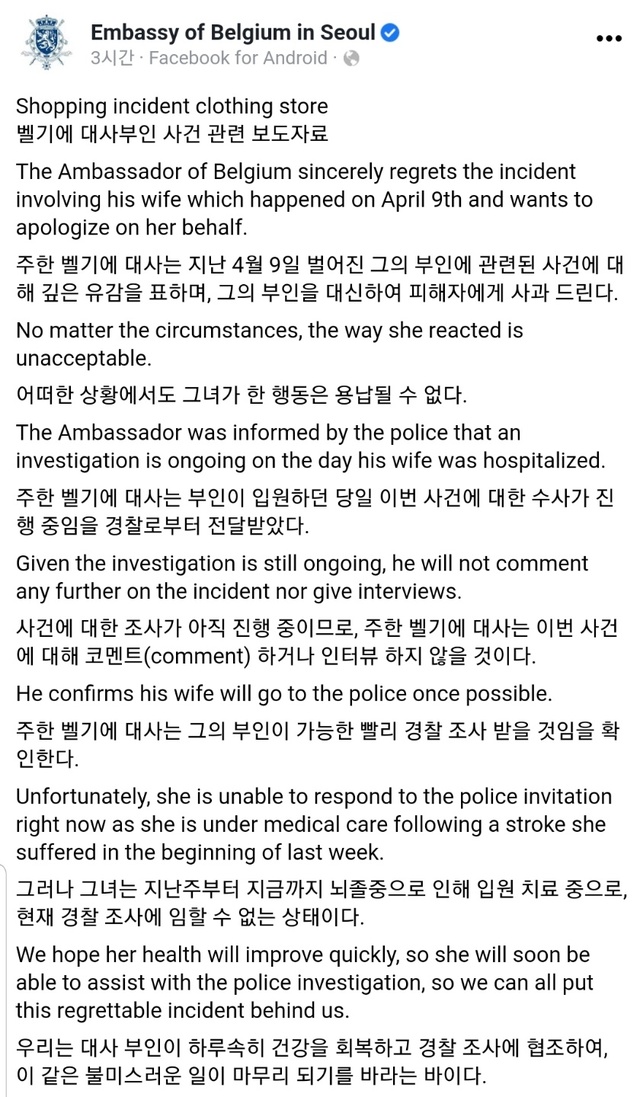 한편 주한 벨기에 대사관은 22일 페이스북을 통해 "대사는 지난 4월9일 벌어진 그의 부인에 관련된 사건에 대해 깊은 유감을 표하며, 그의 부인을 대신해 피해자에게 사과드린다"고 밝혔다.