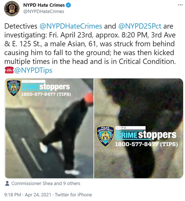 지난 23일(현지시간) 뉴욕의 이스트할렘 지역에서 61세의 중국계 시민을 뒤에서 가격해 쓰러뜨린 뒤 여러 차례 머리를 발로 차서 중상을 입힌 사건이 일어났다고 뉴욕 경찰이 밝혔다. 경찰의 증오범죄 전담 TF팀이 범인을 추적 중이다.