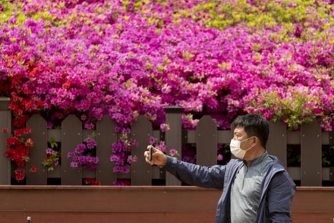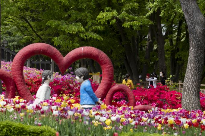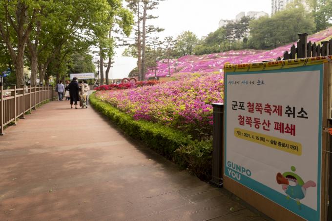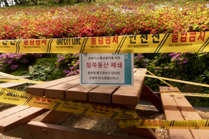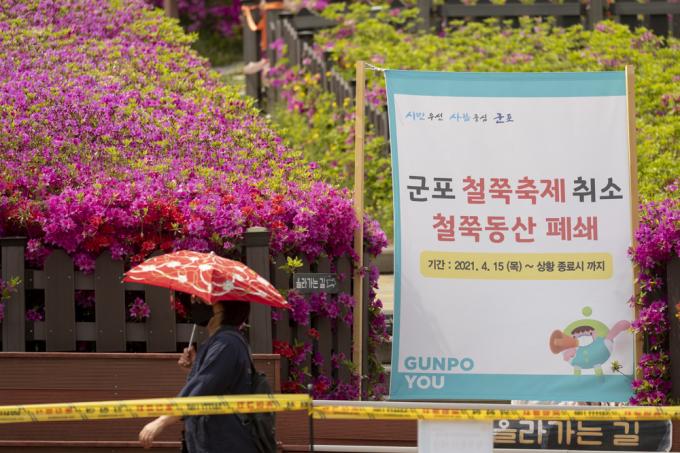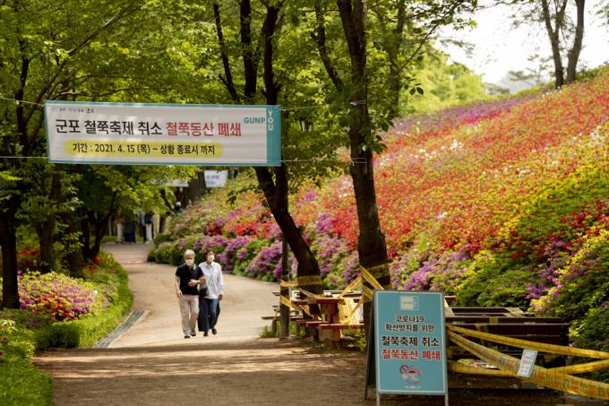 벚꽃이 눈부셔도, 철쭉이 만개해도 다가설 수 없는 봄이다. 26일 오후 코로나19 팬데믹에 폐쇄된 경기 군포 철쭉동산 옆을 노부부가 쓸쓸히 지나고 있다..