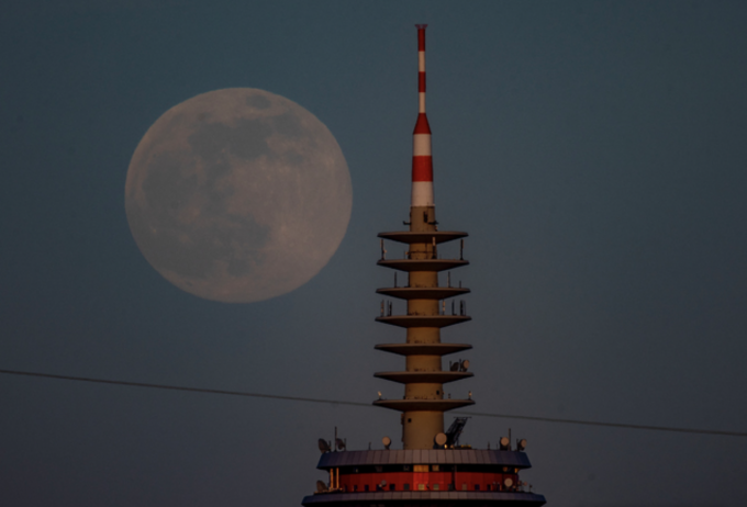 26일(현지시간) 독일 프랑크푸르트 시내 TV 타워 뒤로 슈퍼문이 떠오르고 있다. [AP 뉴시스]