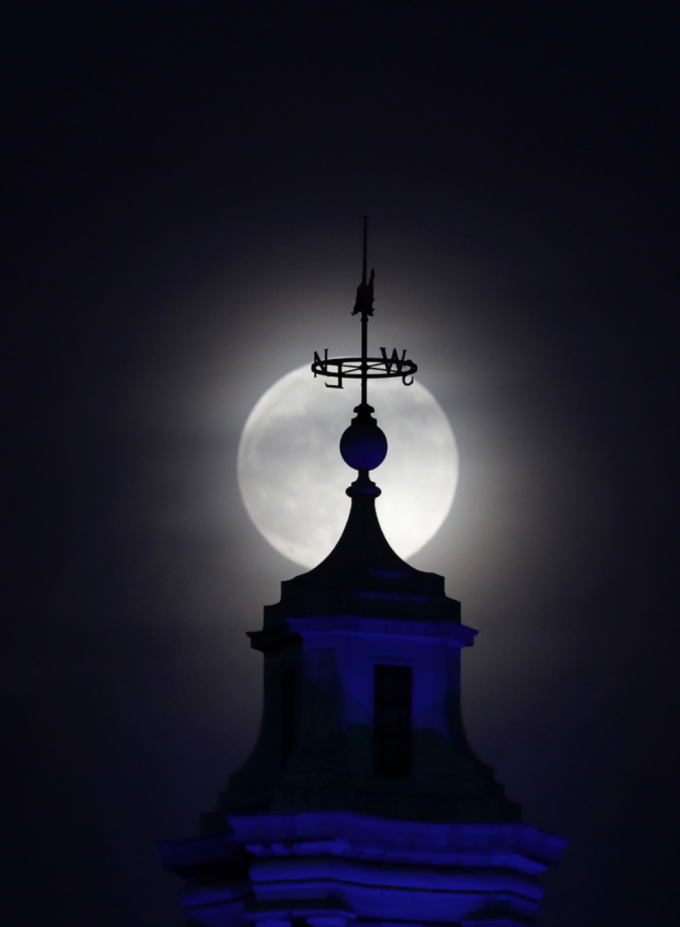 26일(현지시간) 영국 런던의 카운티 홀 위 구름 사이에 걸린 슈퍼문. [AP 뉴시스]
