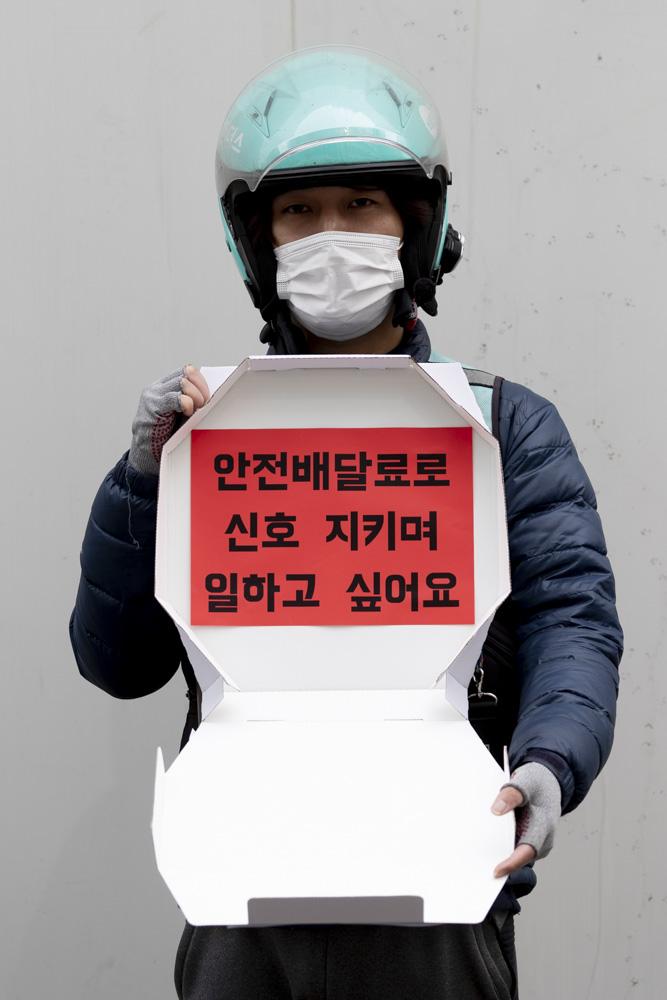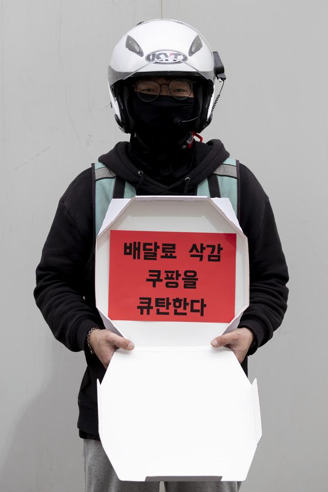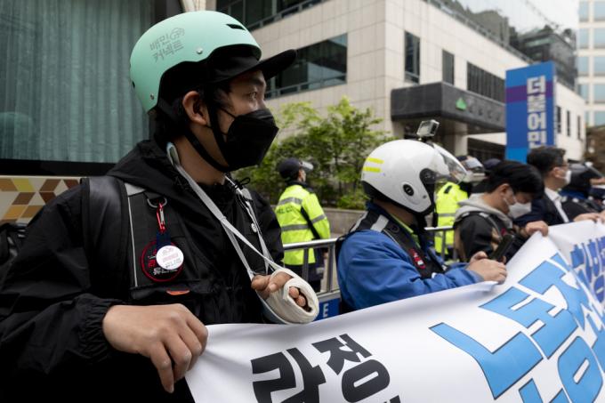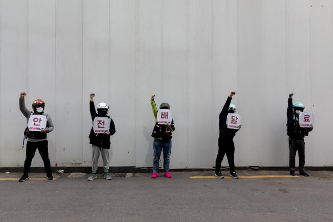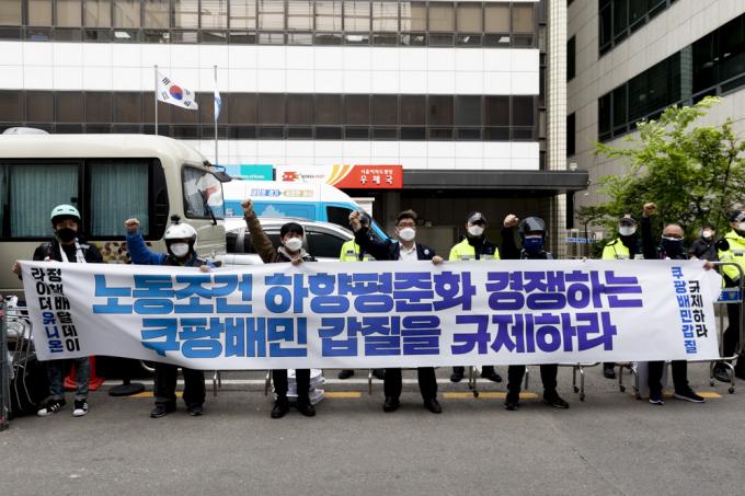 배달 노동자들의 노조인 라이더유니온이 28일 서울 여의도 더불어민주당사 앞에서 '라이더 처우개선 촉구 기자회견'중 구호를 외치고 있다.