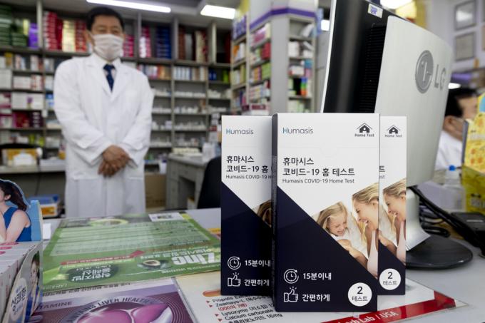 자가진단키드 '휴마시스 코비드-19 홈 테스트'가 3일 출시됐다. 식품의약품안전처는 지난달 23일 에스디바이오센서와 휴마시스의 신속 항원 진단키트를 조건부 허가했다. 사진은 3일 서울 종로 한 약국에 비치된 휴마시스 자가진단키트.