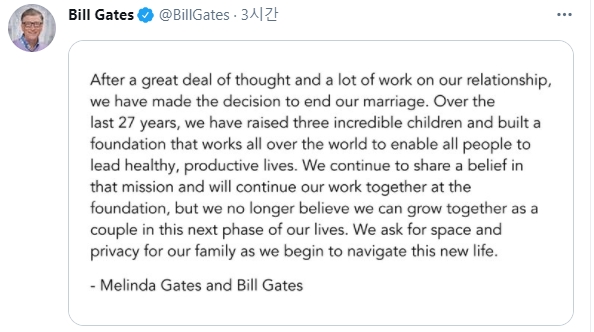 빌과 멜린다는 이날 각각 자신의 트위터에 올린 부부 명의 공동 성명에서 "우리는 27년간의 결혼생활을 끝내기로 결정했다"고 밝혔다.
