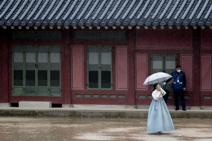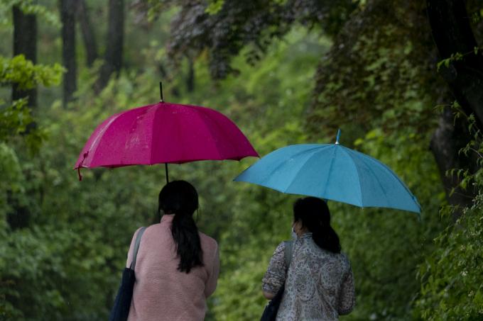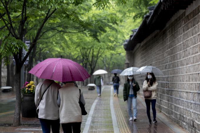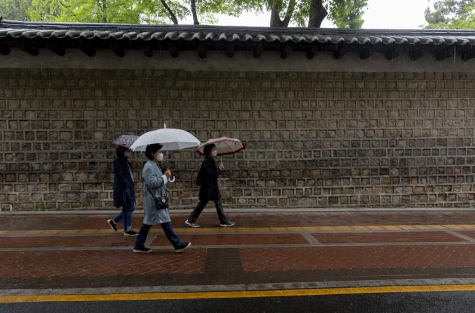수도권 지역에 비가 내리는 4일 오후 서울 덕수궁을 찾은 한 시민이 우산을 쓴 채 산책하고 있다.