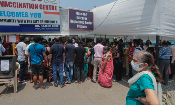 4일(현지시간) 인도 뭄바이의 코로나19 백신 접종소에서 한 여성이 백신이 부족해 접종을 못하자 관계자에게 항의하고 있다. 인도의 코로나19 누적 확진자 수는 2028만2833명, 사망자 22만2408명이다. [AP 뉴시스]