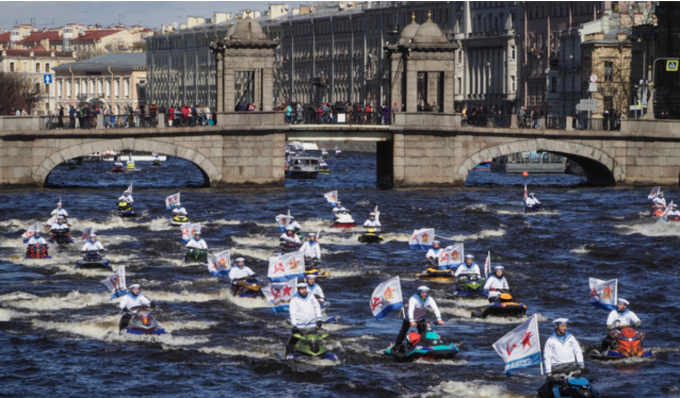 러시아 전승 76주년 기념일인 9일(현지시간) 상트페테르부르크의 폰탄카 강에서 구소련 해군기와 제복을 입은 사람들이 제트 스키 퍼레이드를 펼치고 있다. [AP 뉴시스]