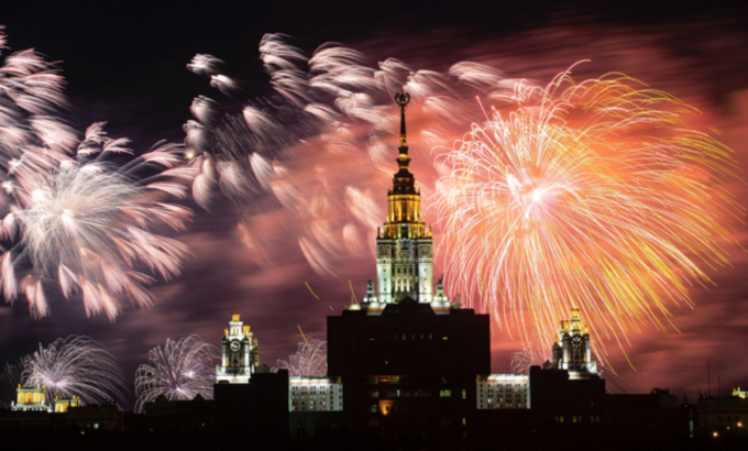 러시아 전승 기념일인 9일(현지시간) 러시아 모스크바에서 제2차 세계대전 전승 76주년 기념식이 열린 가운데 축하 불꽃이 터지고 있다. [AP 뉴시스]