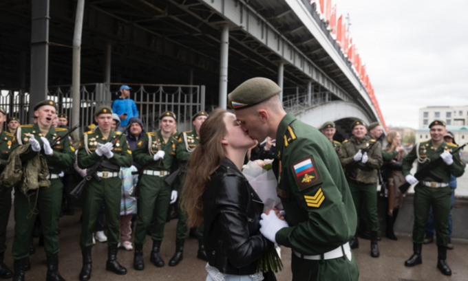 러시아 전승 76주년 기념일인 9일(현지시간) 모스크바 붉은 광장에서 퍼레이드를 마친 한 사관생도가 여자친구와 입맞춤하고 있다. [AP 뉴시스]