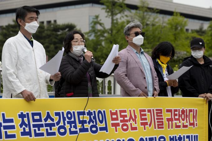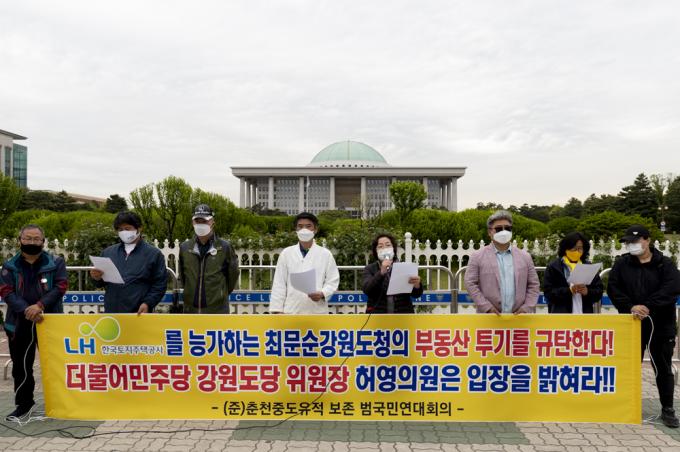 춘천중도유적 보존 범국민연대회의가 10일 오후 서울 여의도 국회 앞에서 'LH를 능가하는 최문순 강원도청의 부동산 투기 규탄'기자회견을 하고 있다.