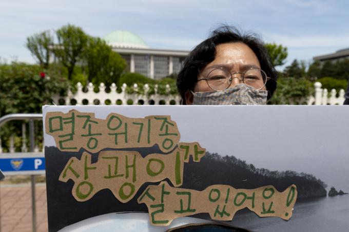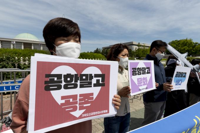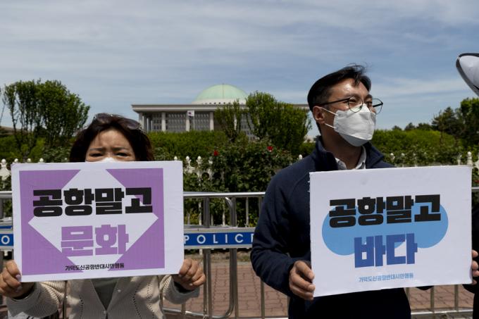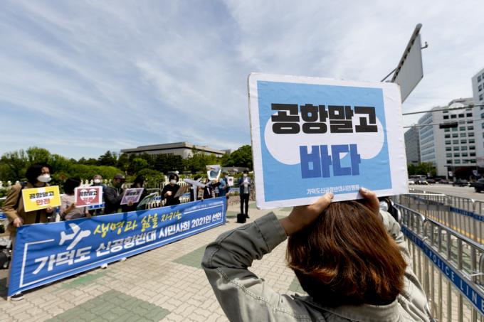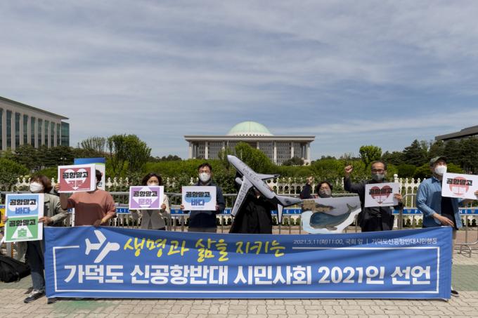 가덕도신공항반대시민행동이 11일 서울 여의도 국회 앞에서 '가덕도신공항반대 시민사회 2021인 선언 기자회견'중 구호를 외치고 있다. 이들은 기자회견에서 "영국 히드로공항의 활주로 추가건설 계획도 파리협약의 온실가스 감축 책무를 위반한다 하여 위법 판결을 받았다"고 밝혔다. 또 "지난 4월 프랑스 하원은 열차를 2시간30분 내로 이동할 수 있는 거리의 국내선 항공 운항을 금지하는 내용의 법안을 통과시켰다"고 소개했다. 이들은 "이것이 변화한 시대에 걸맞은 상식적인 대응이며 탈탄소 시대에 신공항은 어울리지 않는다"고 주장했다.