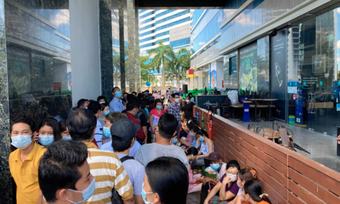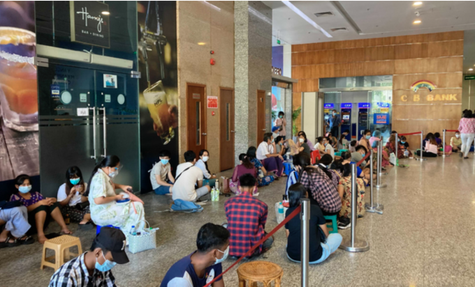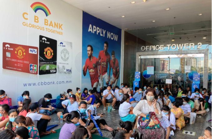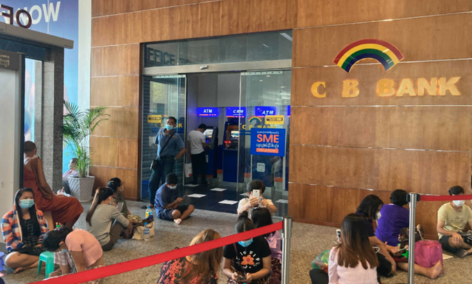 11일(현지시간) 미얀마 양곤의 대형 쇼핑몰 은행 지점 현금자동인출기(ATM)앞에서 현금을 인출하려는 시민들이 바닥에 앉아 몇 시간째 기다리고 있다. 미얀마는 중앙은행의 현금 보유액이 바닥나 일일 현금 인출 가능액을 줄였다. [AP 뉴시스]
