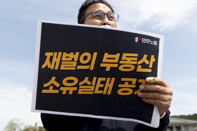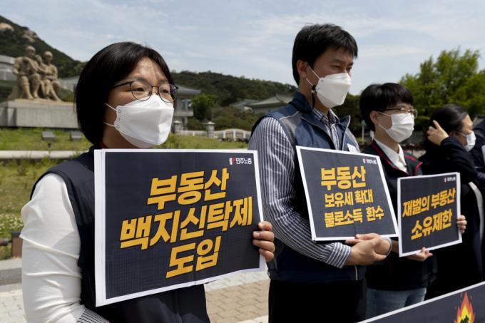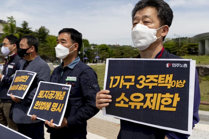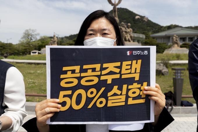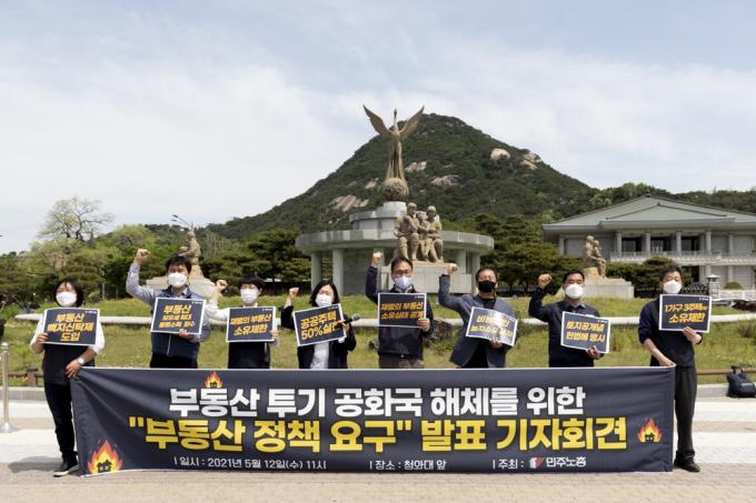 12일 청와대 앞에서 민주노총 주최 부동산문제 해결 요구 발표 기자회견이 진행 중이다.