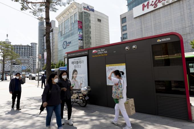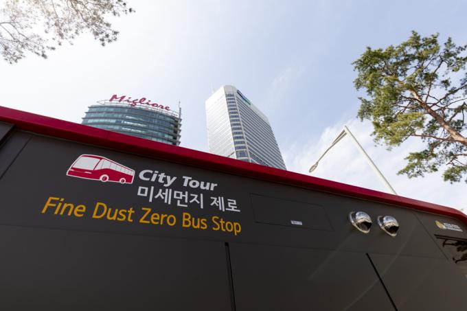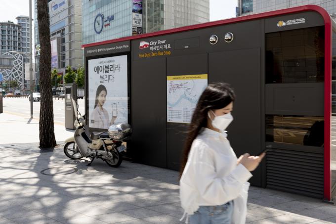 한국건설기술연구원은 12일 식물을 활용해 야외 공간에서도 최대 60%까지 미세먼지를 저감할 수 있는 '미세먼지 제로 버스정류장'을 개발했다고 밝혔다. 연구원에 따르면 서울 중구 DDP 앞에 설치한 정류장의 미세먼지 저감 성능을 측정한 결과 동일 지점의 실외 공기보다 최대 60%까지 저감됐다. 해당 정류장은 2018년 한양대역 앞에 최초 설치 후 지난해 12월 DDP 앞에 설치됐다. 사진은 12일 오후 DDP 앞 해당 버스 정류장.