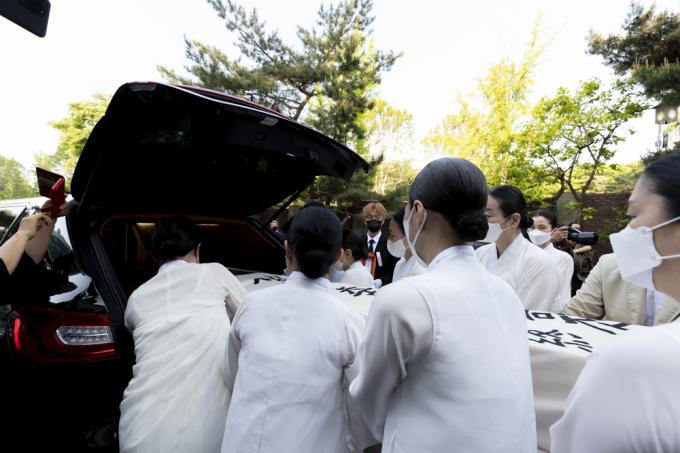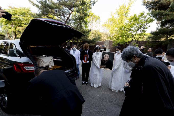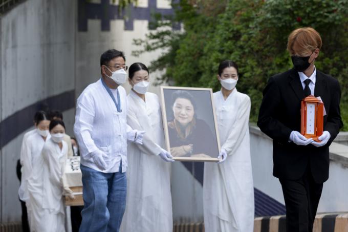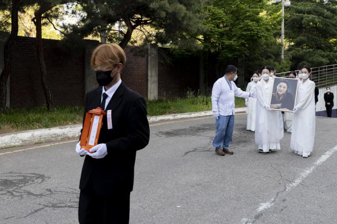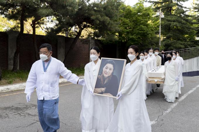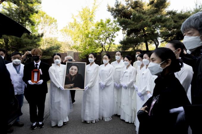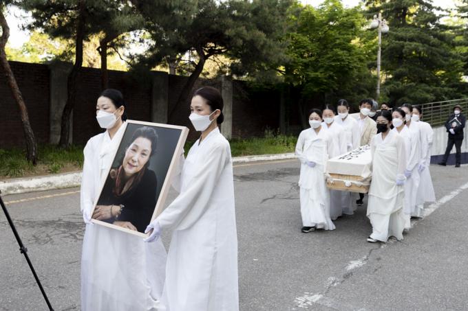 13일 오전 서울 종로구 서울대병원 장례식장에서 국가무형문화재 제27호 '승무' 보유자이자 '민주화 열사'의 넋을 달래주던 이애주 선생(서울대 명예교수)의 발인식이 엄수되고 있다.