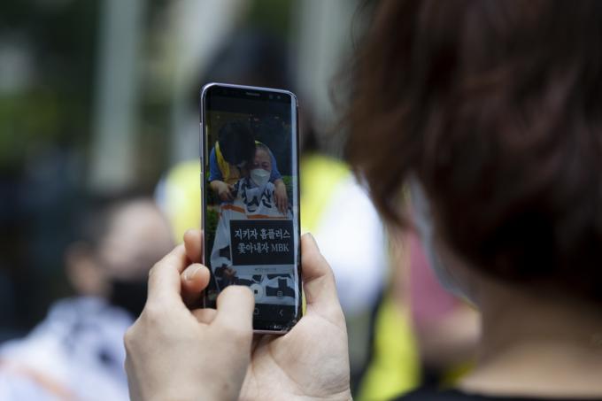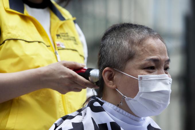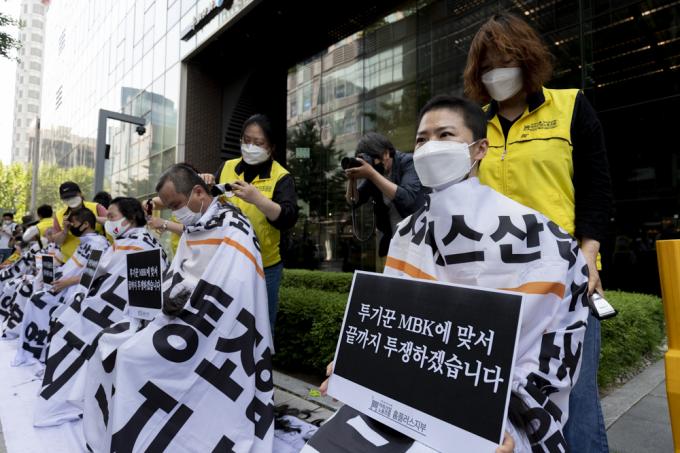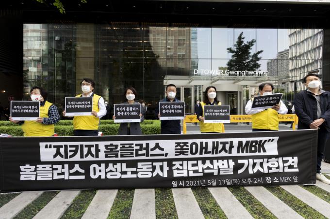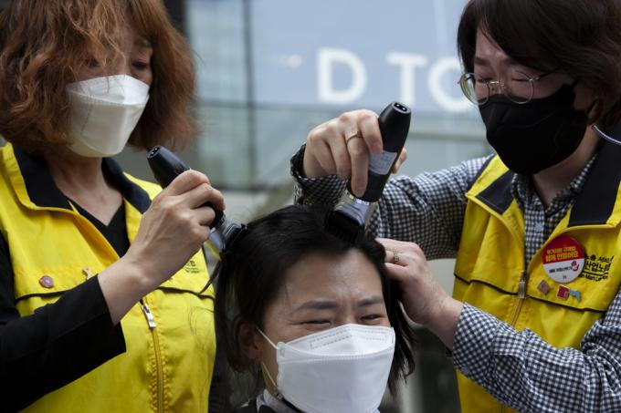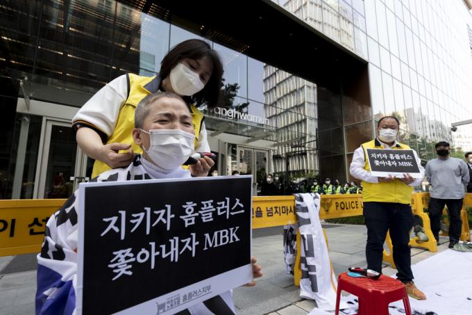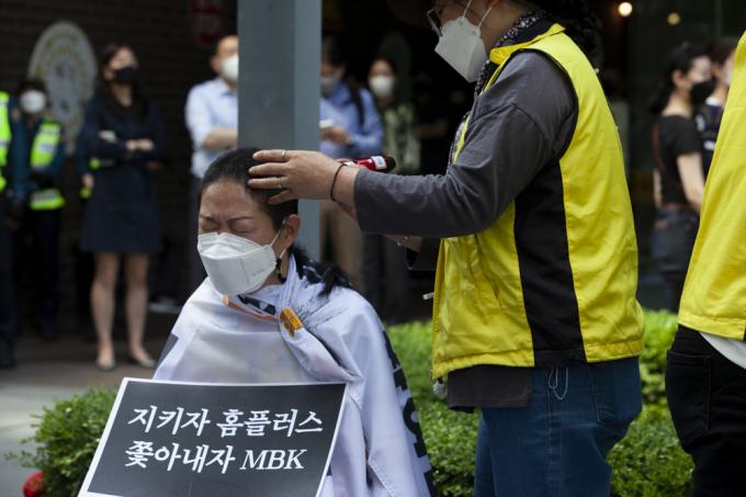 홈플러스 여성 노동자들이 13일 서울 광화문 디타워 MBK 앞에서 홈플러스 최대주주인 MBK파트너스의 주요 점포 폐점 매각을 규탄하며 집단 삭발을 하고 있다.