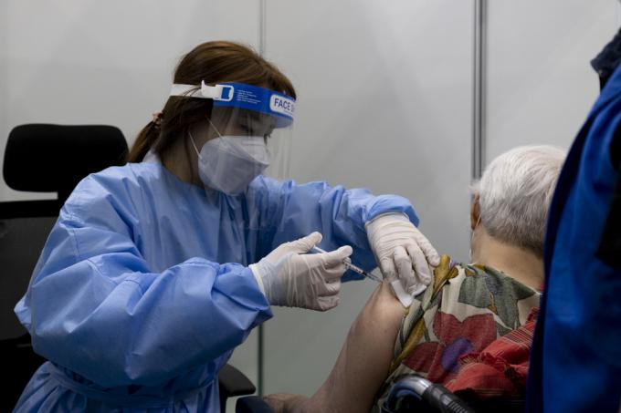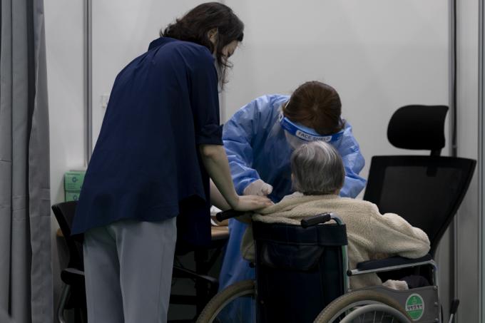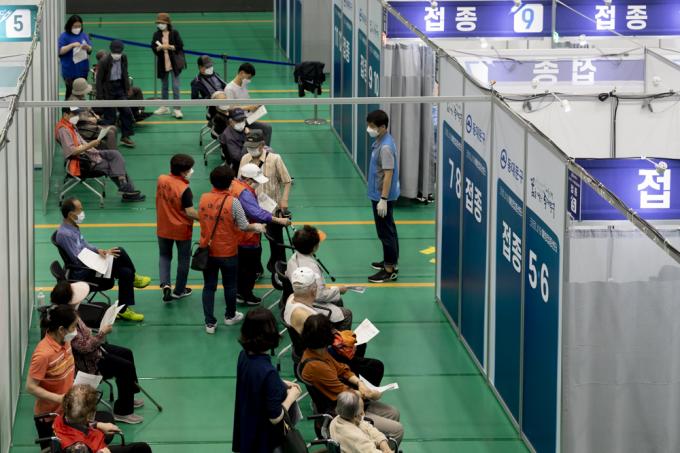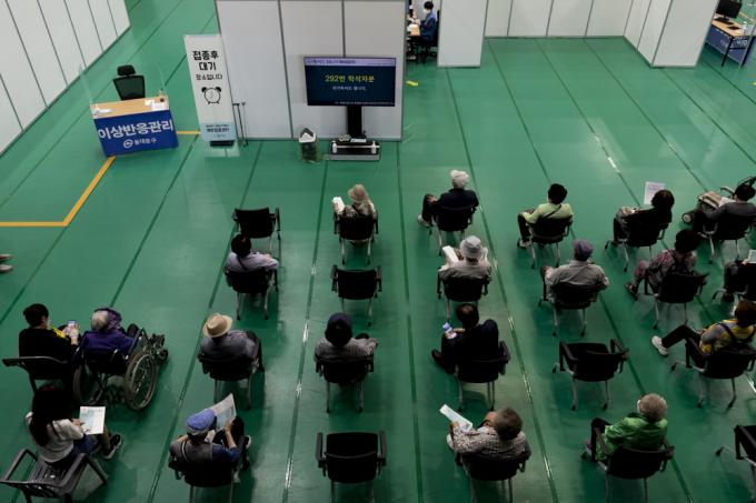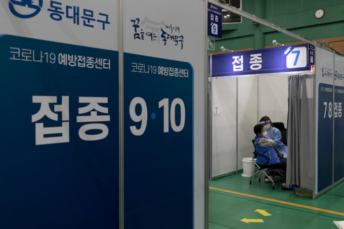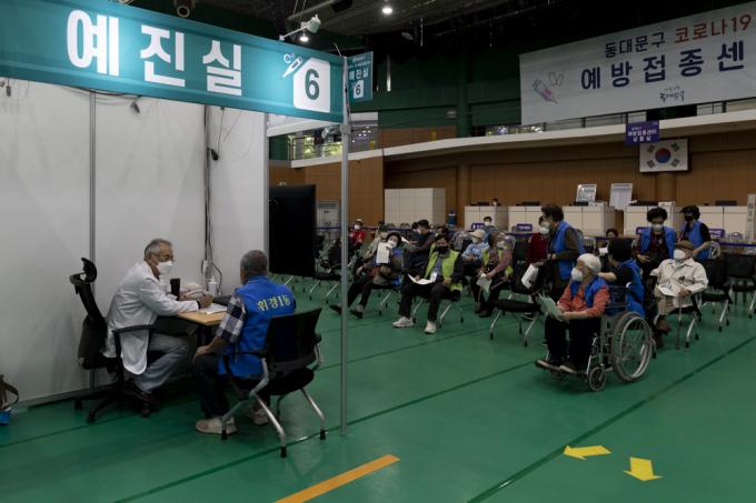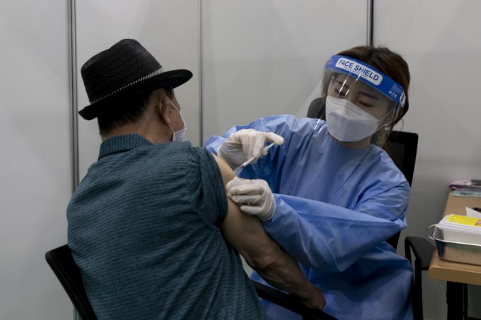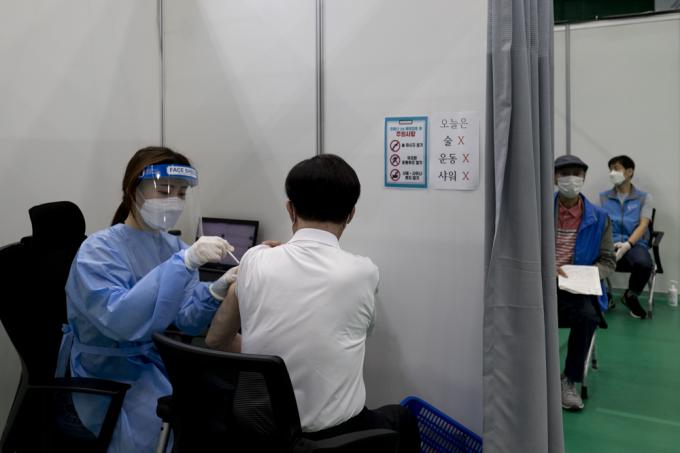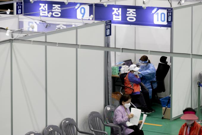 아스트라제네카(AZ) 백신 2차 접종이 본격적으로 시작된 14일 서울 동대문구 예방접종센터에서 한 어르신이 코로나19 백신을 맞고 있다.