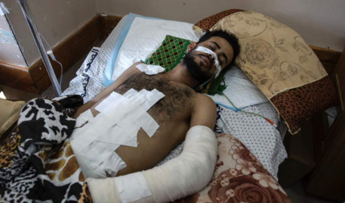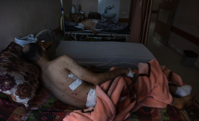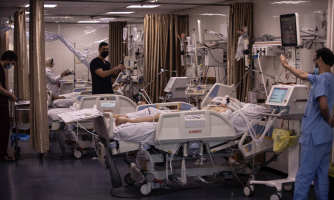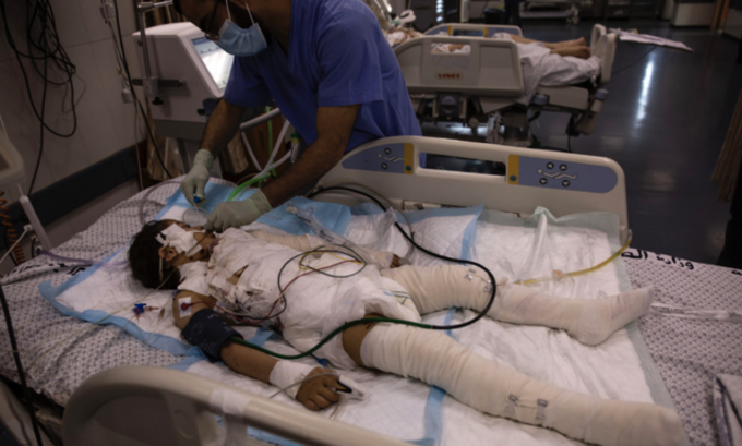 13일(현지시간) 팔레스타인 가자 지구의 시파 병원 중환자실에서 이스라엘 공습으로 부상한 소녀가 치료받고 있다. 가자지구 내 의료시스템은 코로나19와 이스라엘 공습으로 이중고를 겪고 있다. [AP 뉴시스]