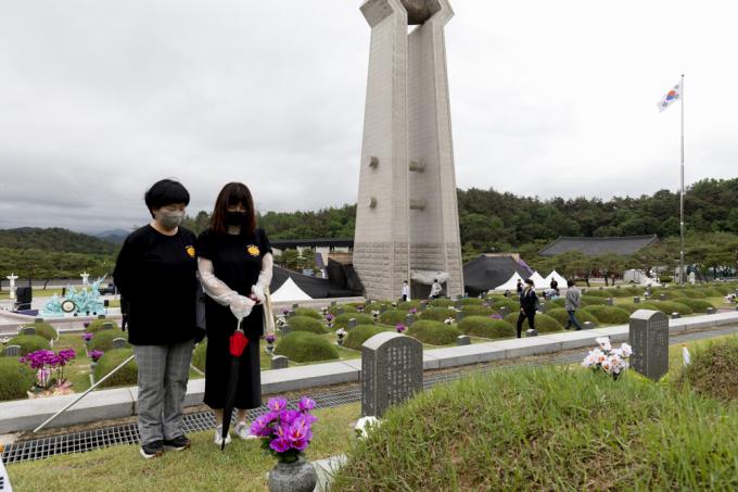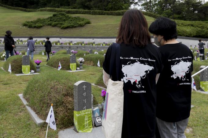 제41주년 5·18 민주화운동 기념일을 하루 앞둔 17일 광주 북구 국립5·18민주묘지에서 '미얀마 후원티셔츠'를 입은 YMCA 관계자들이 참배하고 있다.