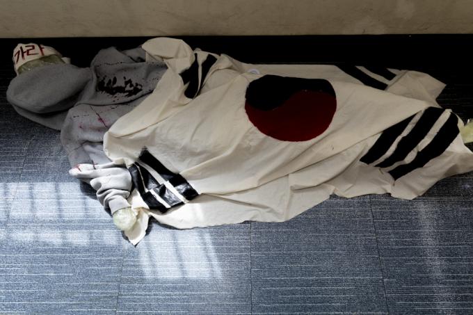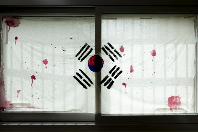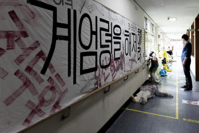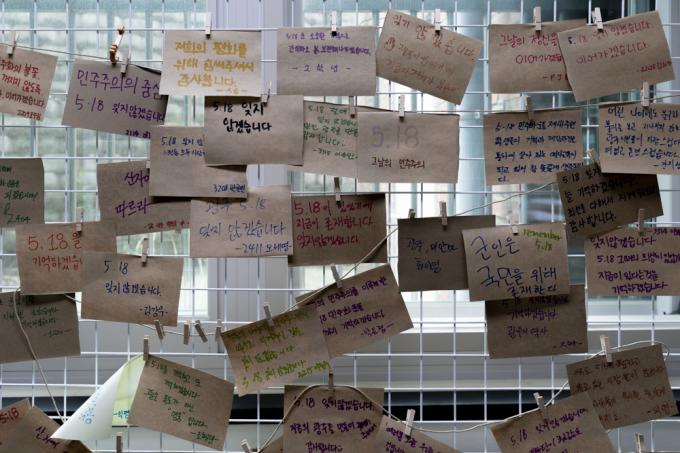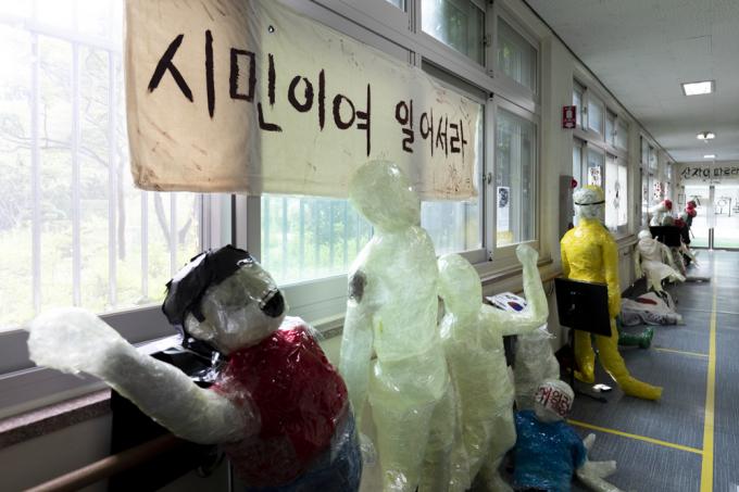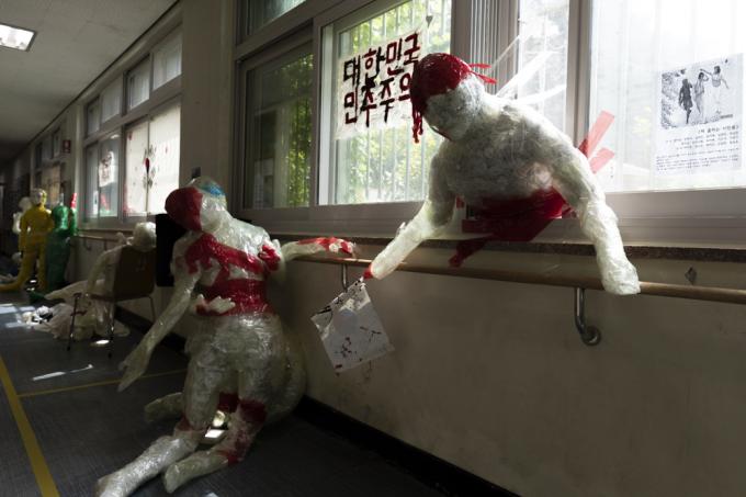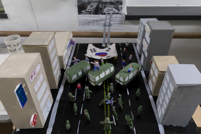 41주년 5·18 민주화운동 기념일인 18일 광주 광산구 동명고등학교에서 한 시민이 동명고 학생들이 제작한 '5·18 민주화운동 역사적 순간, 오월의 길'을 관람하고 있다. 27일까지 열리는 이번 전시에서 학생들은 인체에 접착테이프 등으로 본을 떠 제작하는 '라이프 캐스팅 기법'을 활용했다.