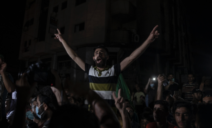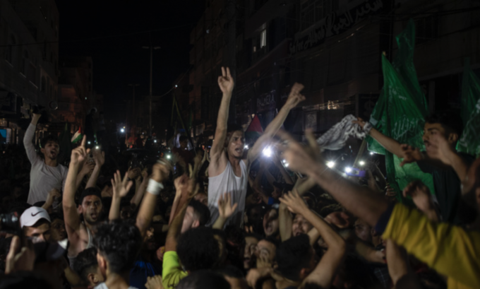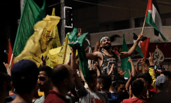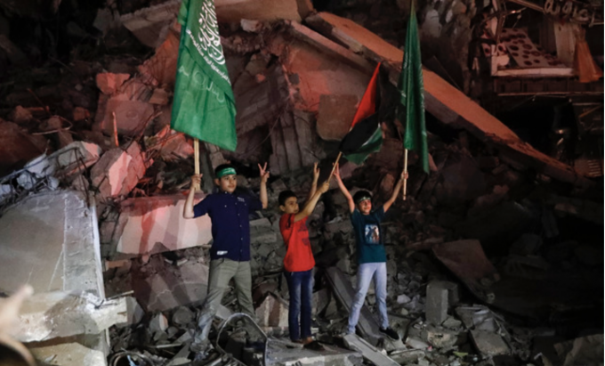 21일(현지시간) 팔레스타인 가자 지구에서 어린이들이 팔레스타인과 하마스 깃발을 흔들며 이스라엘과의 휴전을 기뻐하고 있다. 이날 이스라엘과 팔레스타인 무장 정파 하마스는 수백 명의 사망자를 낸 11일간의 유혈 충돌을 중단 하기로 합의했다. [AP 뉴시스]