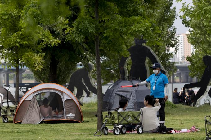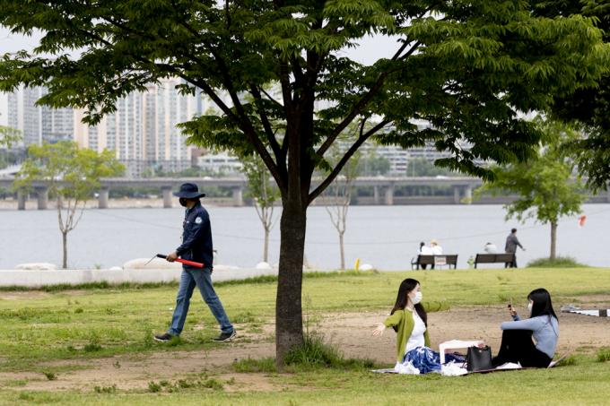 정부가 코로나19 백신 접종 완료자에 대한 일상 회복 지원 방안을 발표한 26일 오후 서울 여의도 한강공원에서 방역 관계자가 마스크 미착용 단속을 하고 있다. 이 방안에 따르면 오는 7월부터 1차 접종자는 야외에서 마스크를 쓰지 않아도 된다. 또 실외 다중이용시설이나 정규 종교 활동 시 인원 제한에서 제외된다.