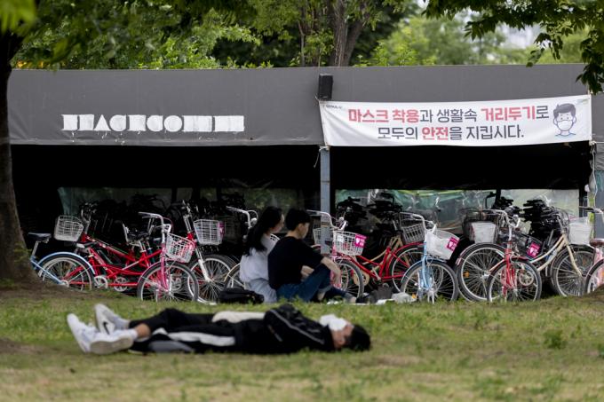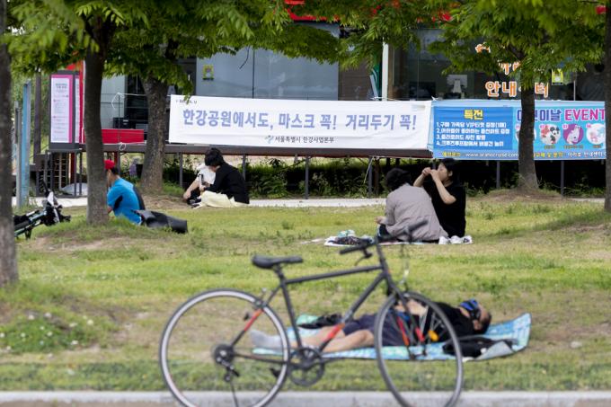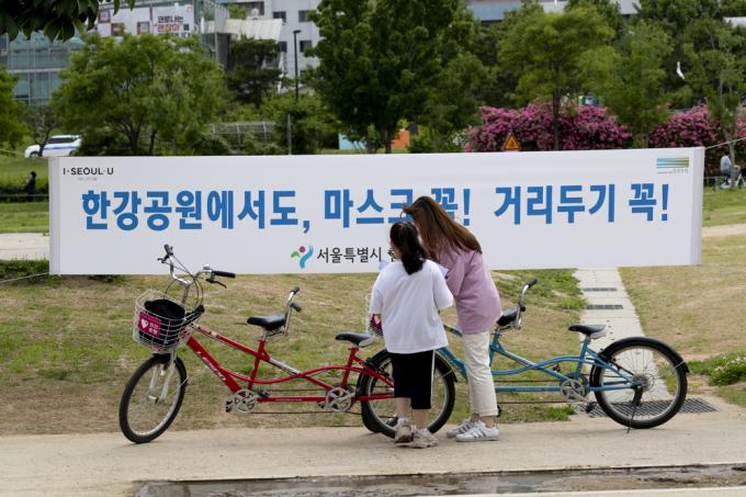26일 오후 서울 여의도 한강공원에 '마스크 착용과 거리두기 의무 현수막'이 걸려 있다.