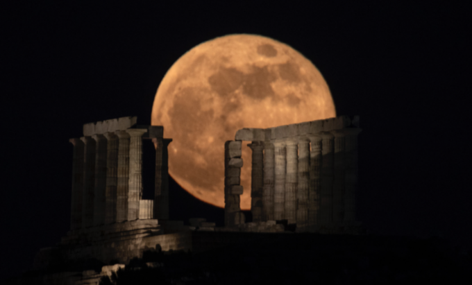 26일(현지시간) 그리스 아테네 남쪽 수니온곶에 있는 고대 포세이돈 신전 뒤로 슈퍼문이 떠오르고 있다. 이번 슈퍼문은 개기월식과 동시에 일어나면서 '슈퍼 블러드문'이 관측됐다. [AP 뉴시스]