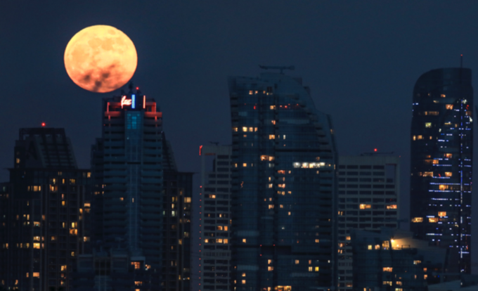 26일 터키 이스탄불의 경제 중심지 마슬라크 건물 뒤로 슈퍼문이 떠오르고 있다. [AP 뉴시스]