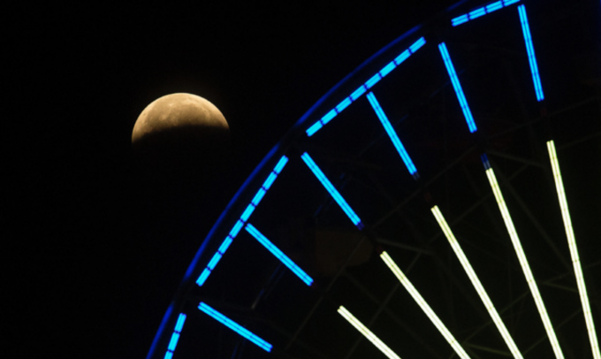 26일 미국 캘리포니아주 샌타모니카에 있는 대관람차 뒤로 개기월식이 관측되고 있다. [AP 뉴시스]