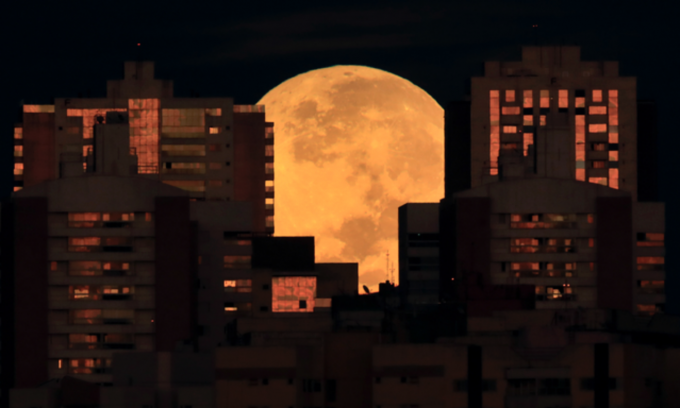 26일 새벽 브라질 브라질리아에서 건물들 뒤로 개기월식이 관측되고 있다. 이번 개기월식은 슈퍼문과 동시에 일어나면서 '슈퍼 블러드문'이 관측됐다. [AP 뉴시스]
