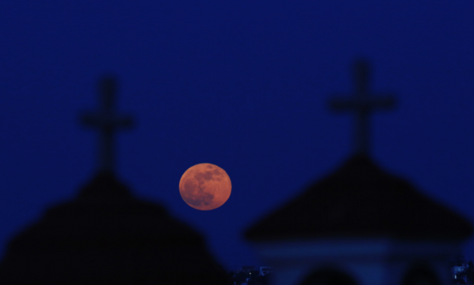 26일 키프로스 수도 니코시아 교외의 데프테라에 있는 기독교 정교회 수도원 근처 십자가 사이로 슈퍼문이 떠 있다. [AP 뉴시스]