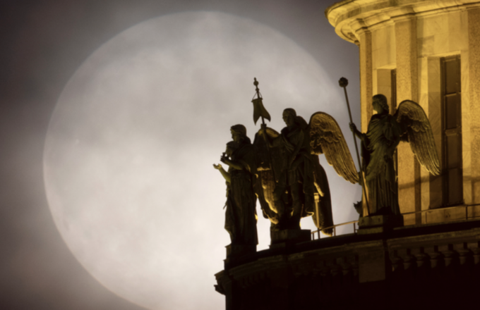 26일 러시아 상트페테르부르크의 성 이사크 대성당에 있는 천사 조각상 뒤로 슈퍼문이 떠오르고 있다. [AP 뉴시스]