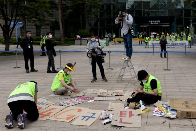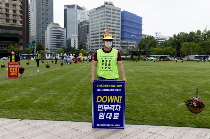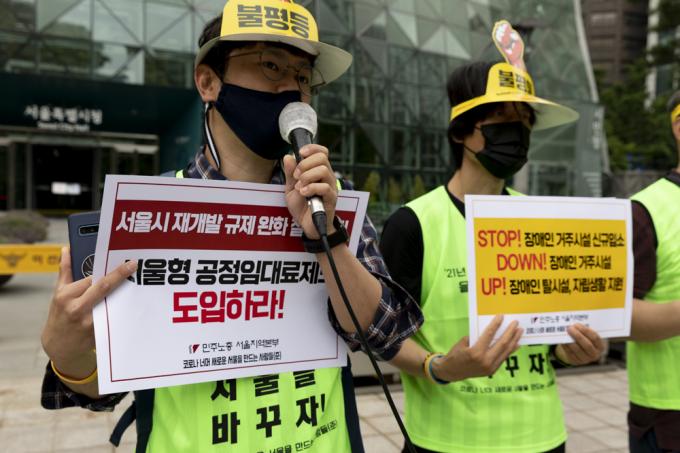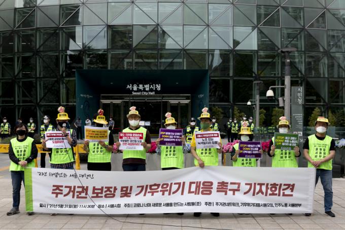 '코로나 너머 새로운 서울을 만드는 사람들'(너머서울)이 31일 서울시청 앞에서 '주거권 보장과 기후위기 대응 촉구' 기자회견을 하고 있다.