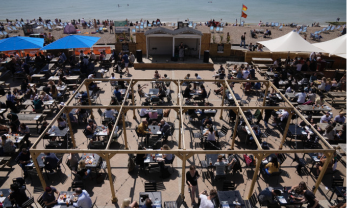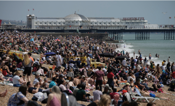 30일(현지시간) 영국 남부 브라이턴 비치에서 해수욕을 즐기는 사람들. 마스크를 쓴 이는 눈에 띄지 않는다. [AP 뉴시스]