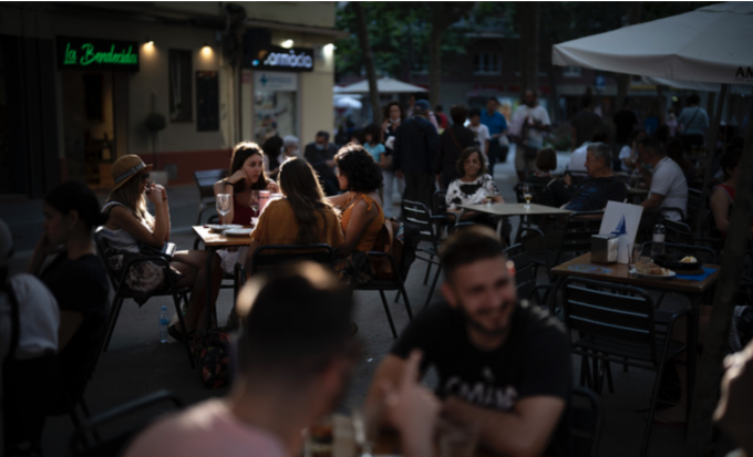 30일(현지시간) 스페인 바르셀로나의 한 술집 야외 테이블에서 시민들이 마스크를 쓰지 않은 채 담소하며 술을 마시고 있다. [AP 뉴시스]