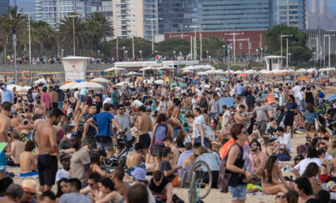 같은 날 바르셀로나의 한 해변. 역시 마스크를 쓰지 않은 채 해수욕을 즐기고 있다. [AP 뉴시스]