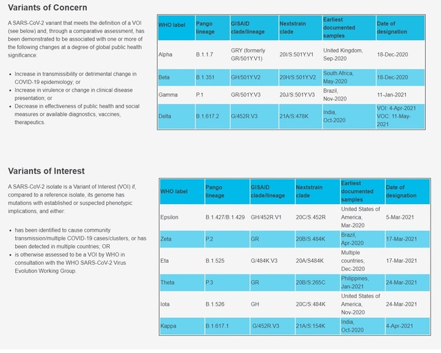 또한 WHO는 우려 변이보다 아래 단계에 있는 '관심 변이(Varients of Interest)' 6종에 엡실론, 제타, 에타 등의 알파벳 이름을 부여했다.